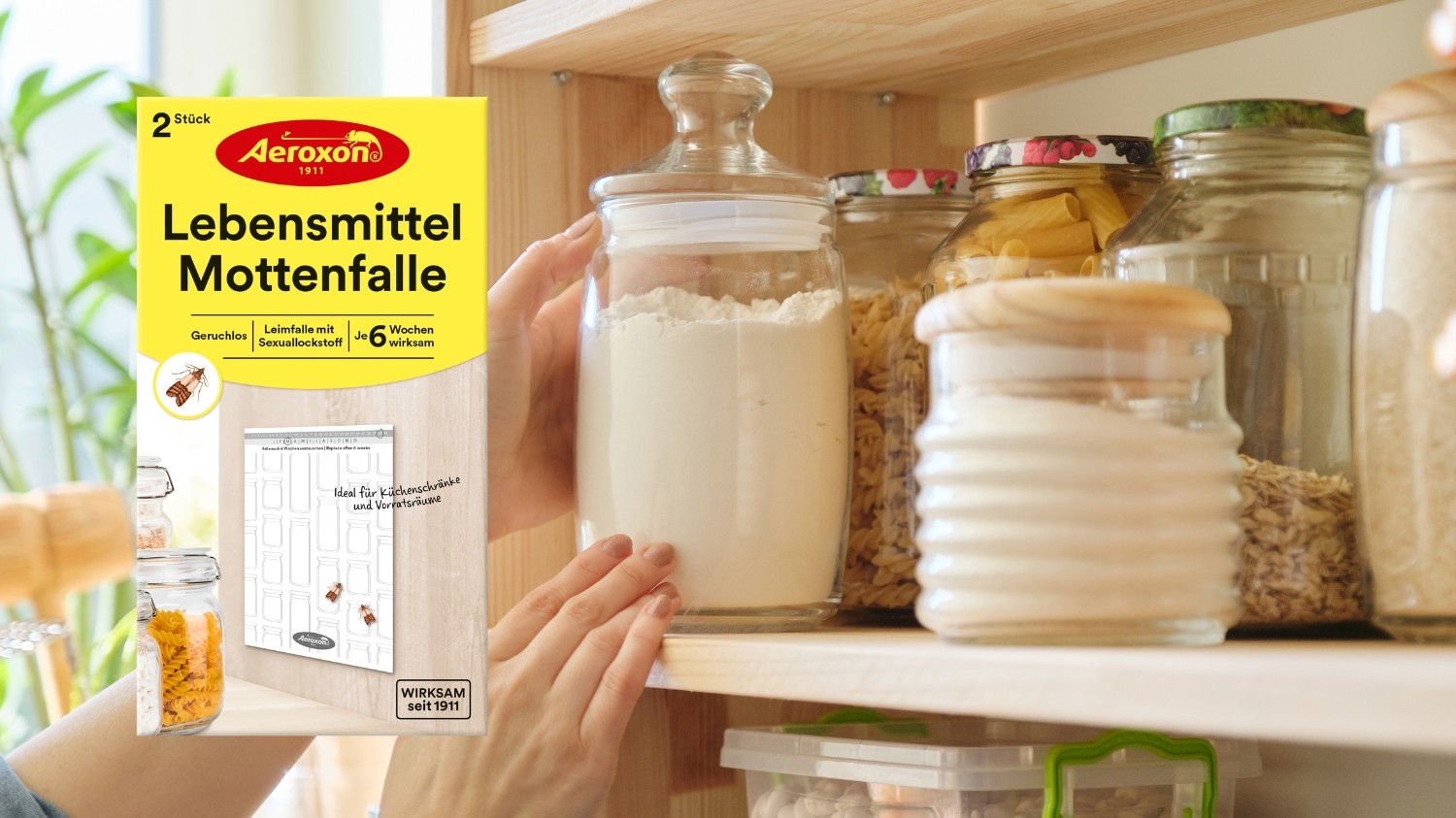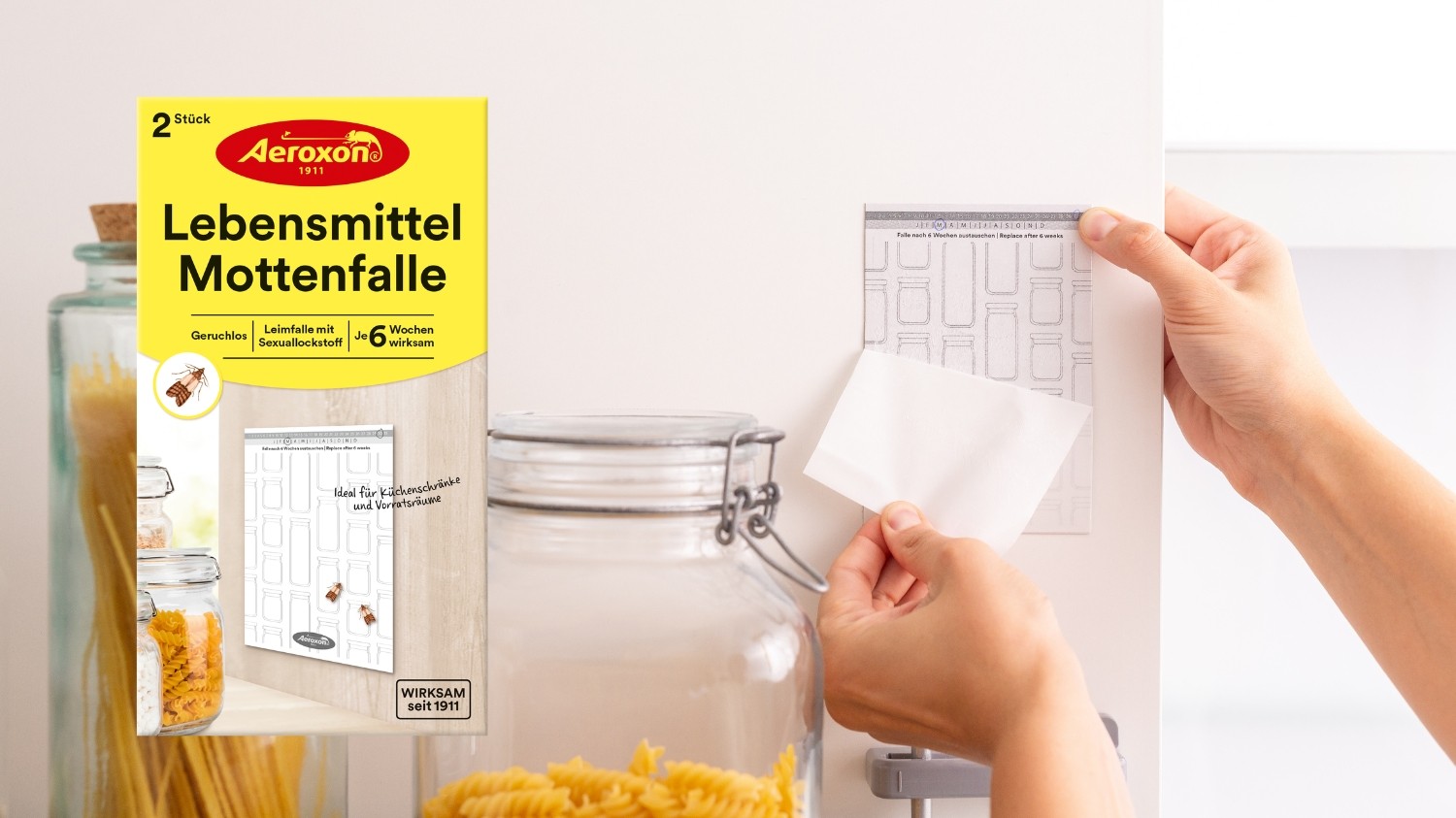 Um festzustellen, ob Lebensmittelmotten vorhanden sind, kommt die Aeroxon Lebensmittelmotten-Falle* zum Einsatz. Es sind die artspezifischen Sexuallockstoffe (Pheromone) der weiblichen Motte, die die männlichen Dörrobst- und Mehlmotten auf die beleimte, geruchlose Lebensmittelmotten-Falle* locken. Somit zeigt sie an, ob Motten vorhanden sind und hilft, den Befall zu reduzieren. Und das ganze 3 Monate lang. Wird ein Befall angezeigt, ist es sinnvoll, unverzüglich entsprechende Maßnahmen einzuleiten.